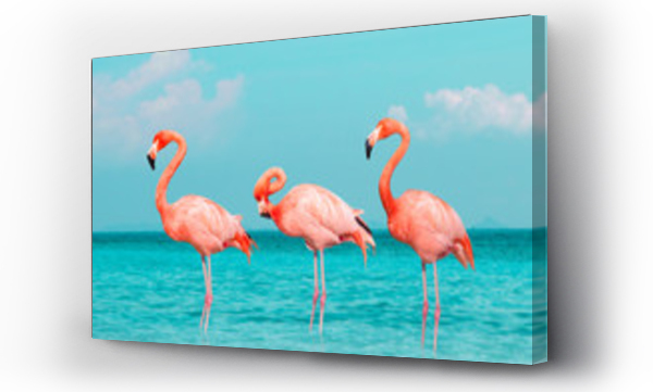 Vintage and retro collage photo of flamingos standing in clear blue sea with sunny sky summer season with cloud.
