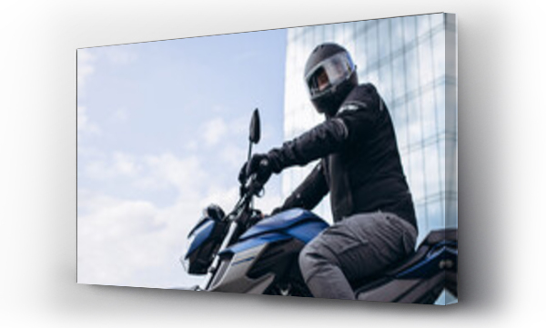 Handsome motorcyclist on his moto riding in the city