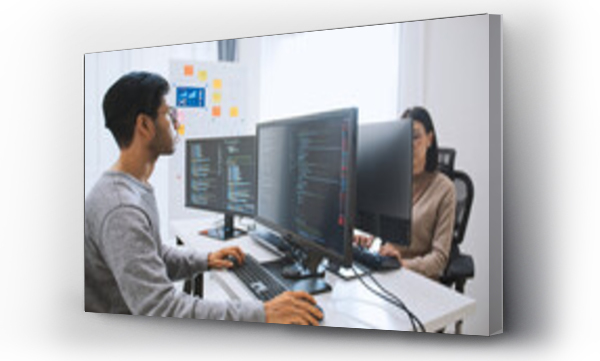 Young adult Asian male, female software developer coding program on desktop computer. Man, woman work from home, remote working, freelance programmer job, smart digital nomad lifestyle concept