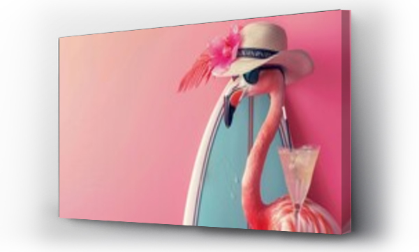 Stylish flamingo posing with a surfboard, wearing a sun hat and sunglasses, cocktail beside, all set against a soft pink background