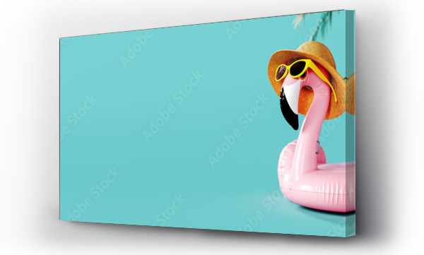 Pink flamingo with hat and sunglasses on turquoise blue background with copy space. Summer travel concept design. 3D Rendering, 3D Illustration